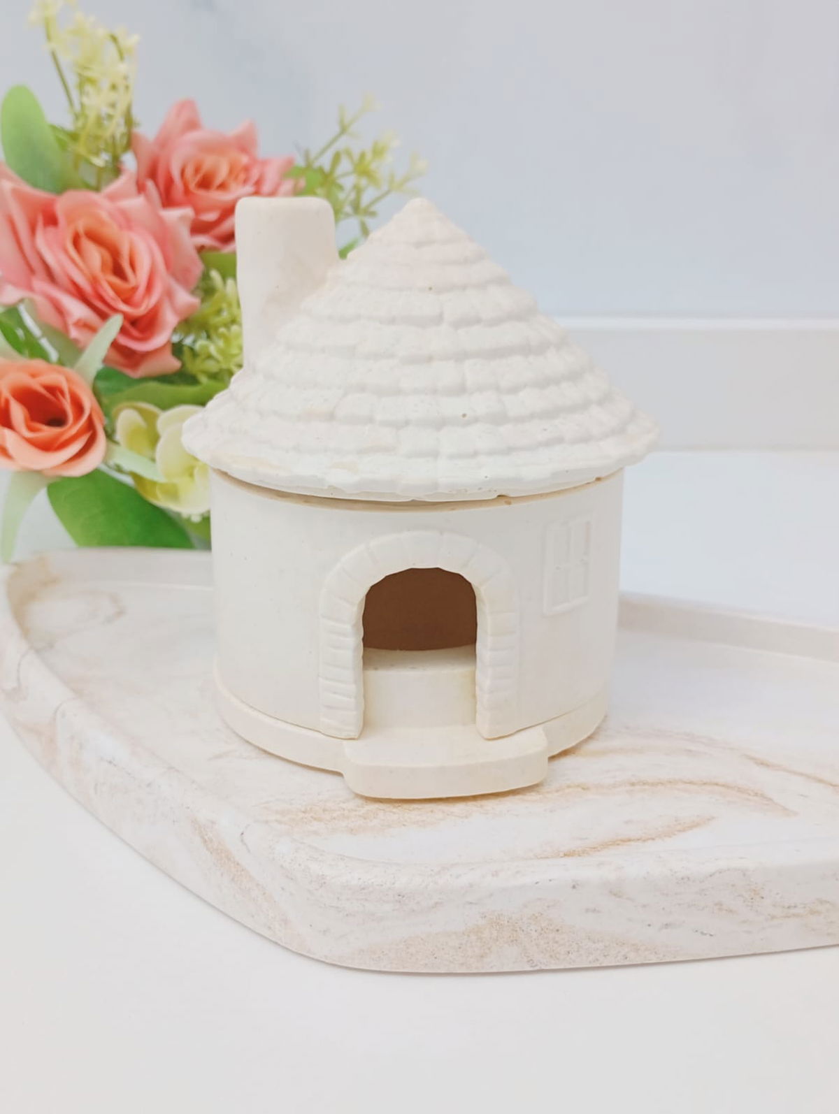 PIEZA ARTESANAL DE RESINA CERAMICA, CASITA CIRCULAR SAHUMADOR, DE CM APROX.