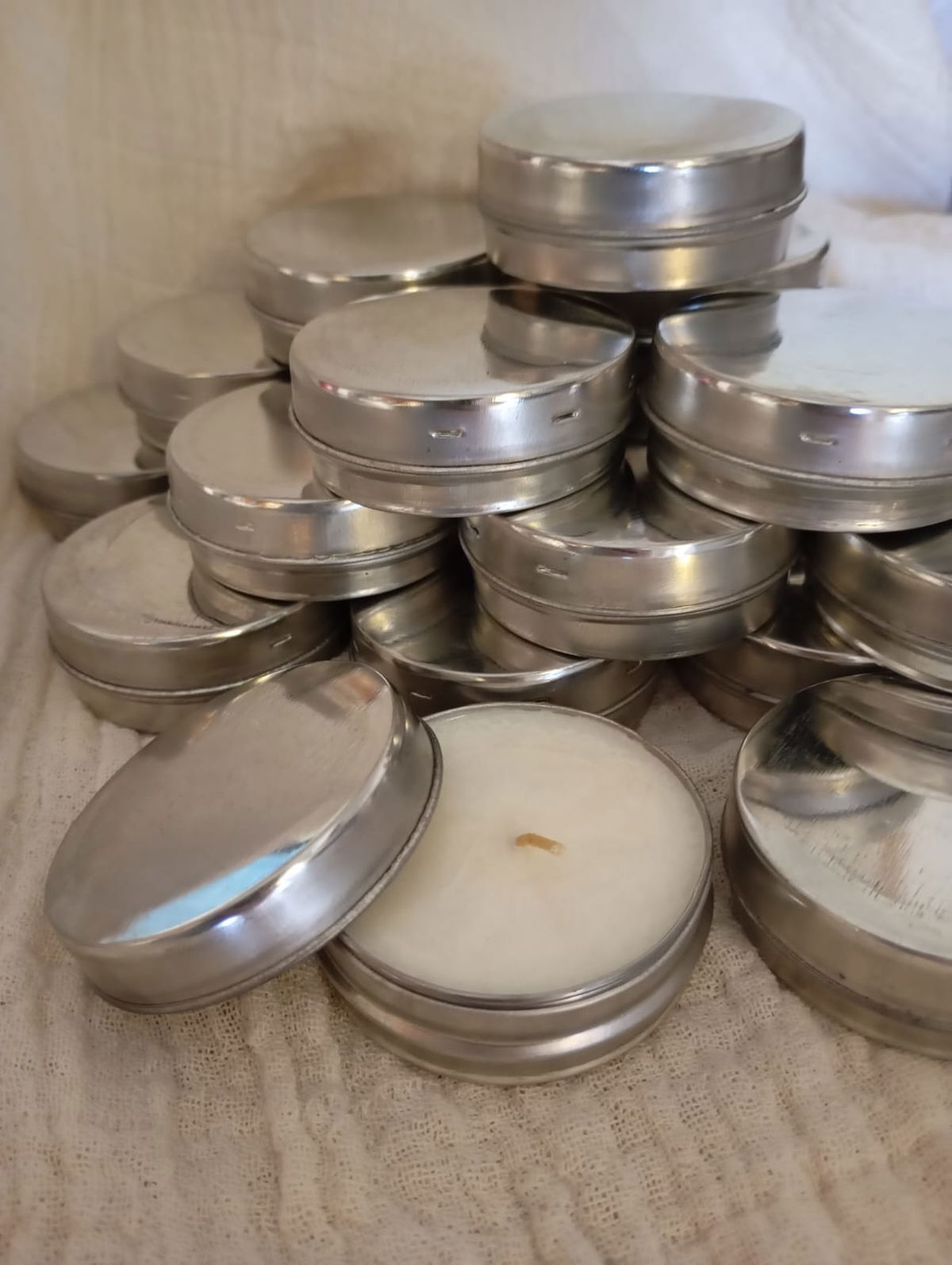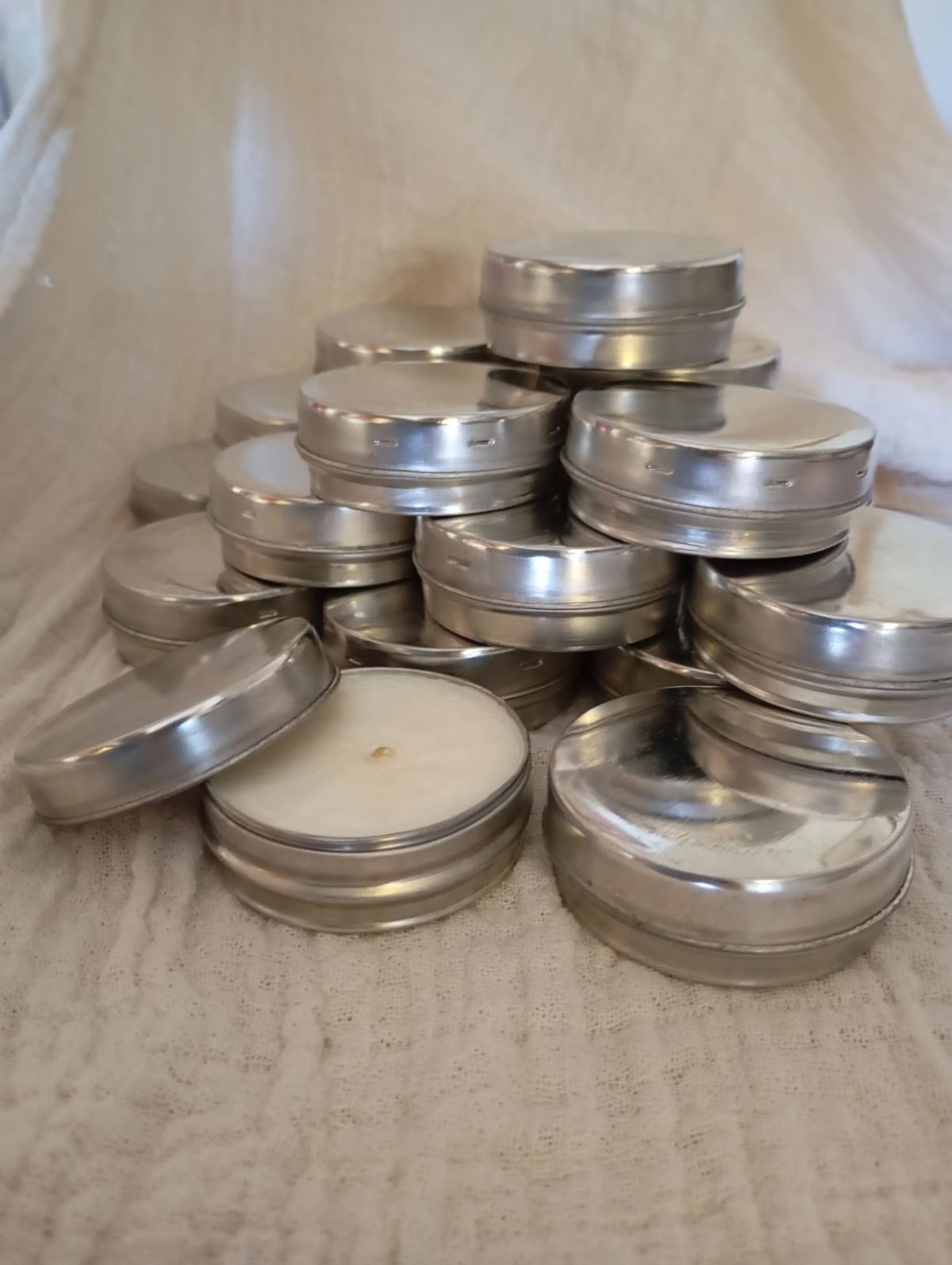 VELAS AROMATICAS DE CERA DE SOJA EN LATA TIPO PASTILLERO, DE 5.8*2.5CM.