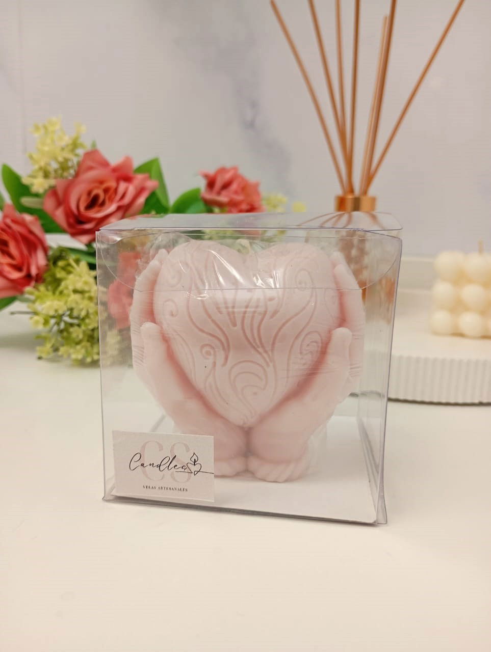 VELA AROMATICA DE CERA DE SOJA, MODELO CORAZON EN MANOS.