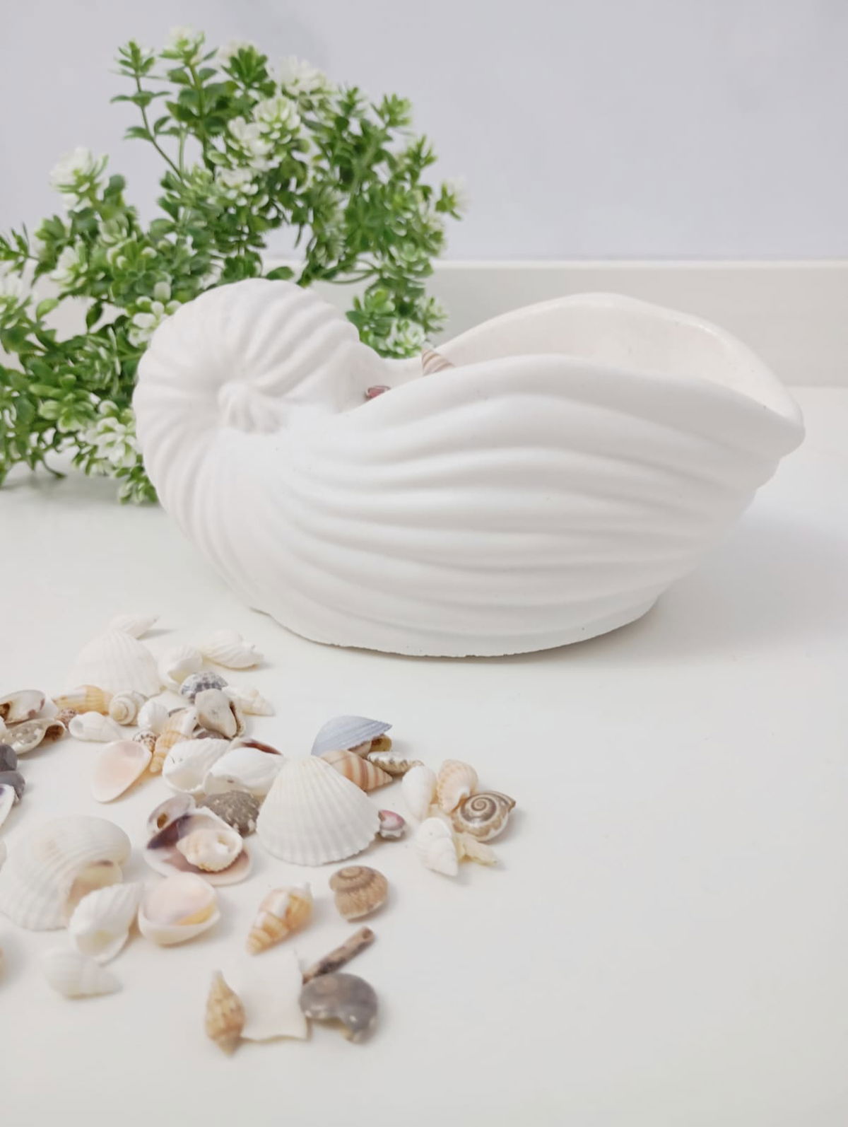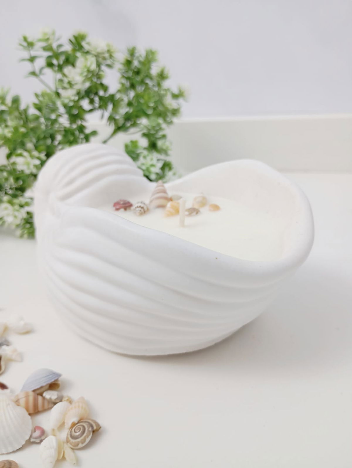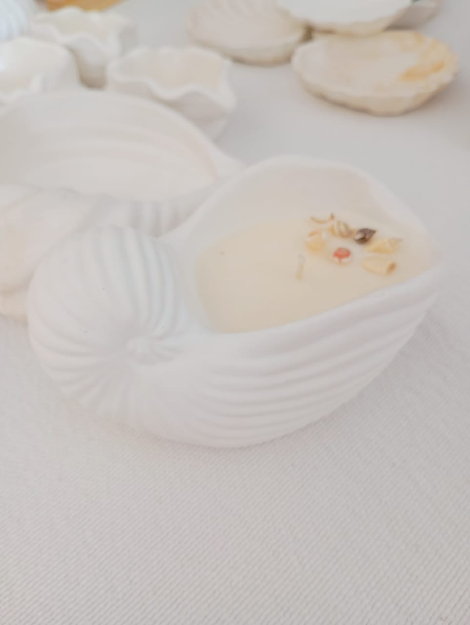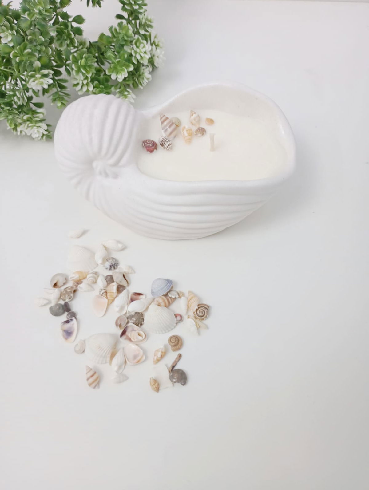 VELA AROMATICA DE CERA DE SOJA, EN PIEZA ARTESANAL DE RESINA CERAMICA - CARACOLA XL, CON DETALLES DE CARACOLES, PERLAS Y/O FIGURAS EN CERA.