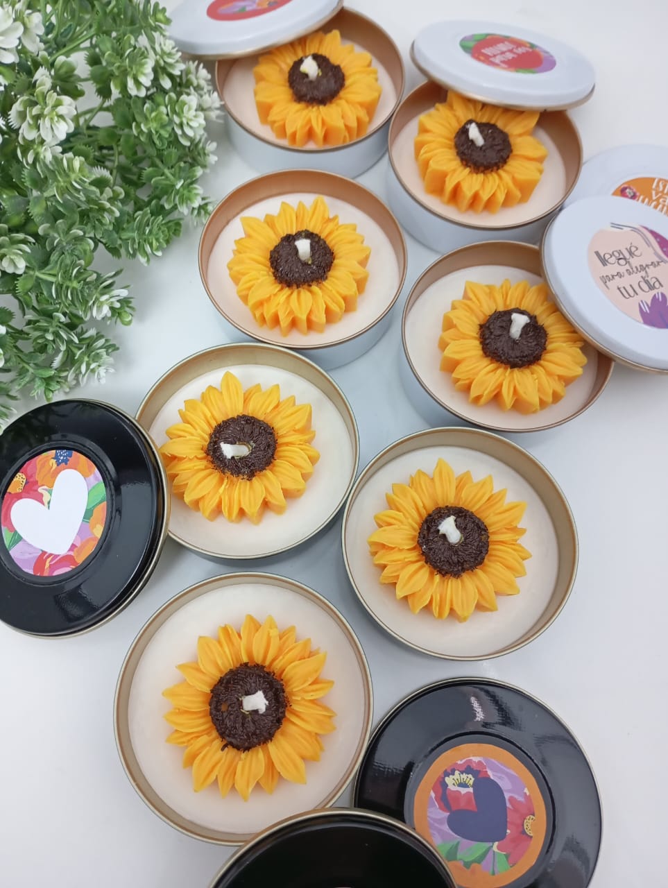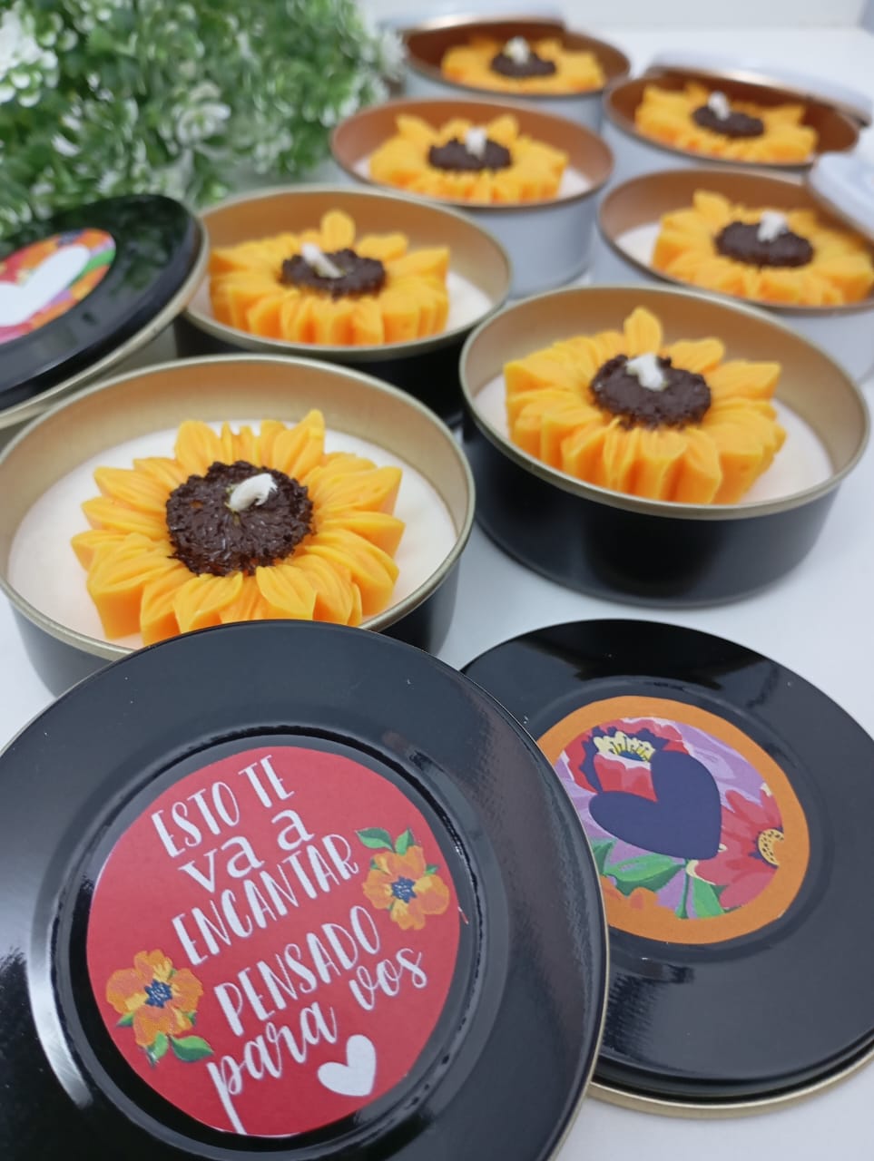VELA AROMATICA DE CERA DE SOJA, EN LATA, CON FLOR GIRASOL.