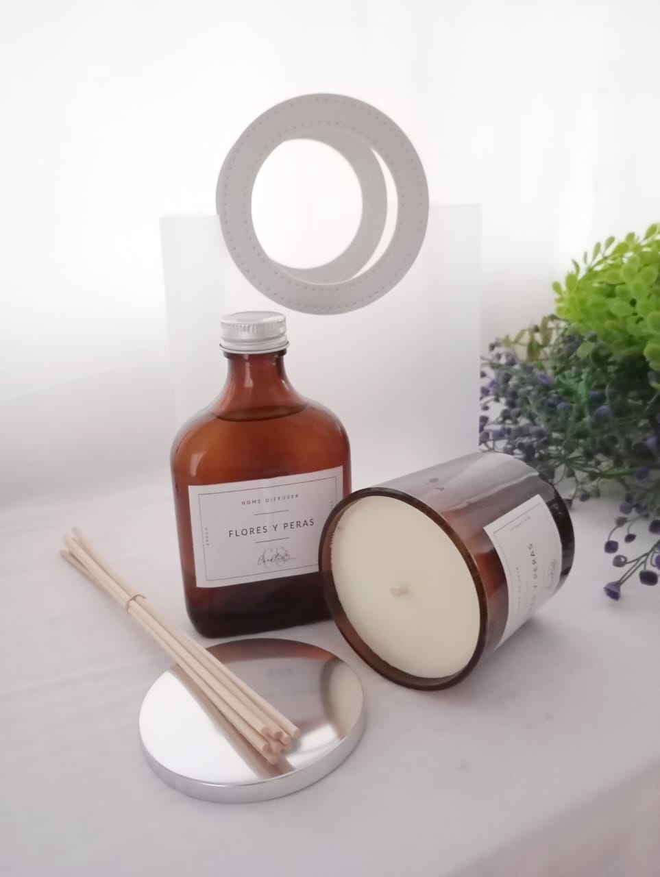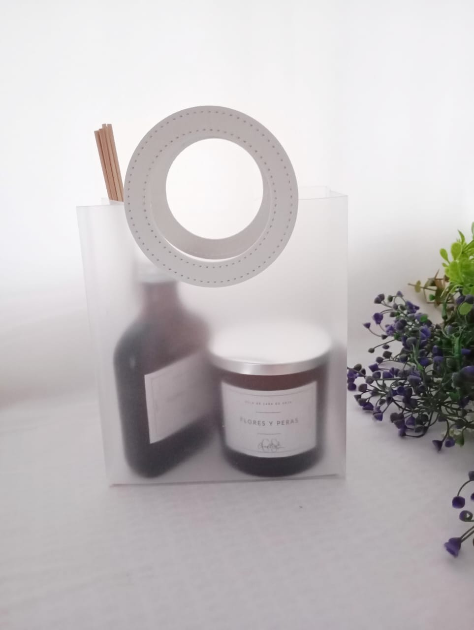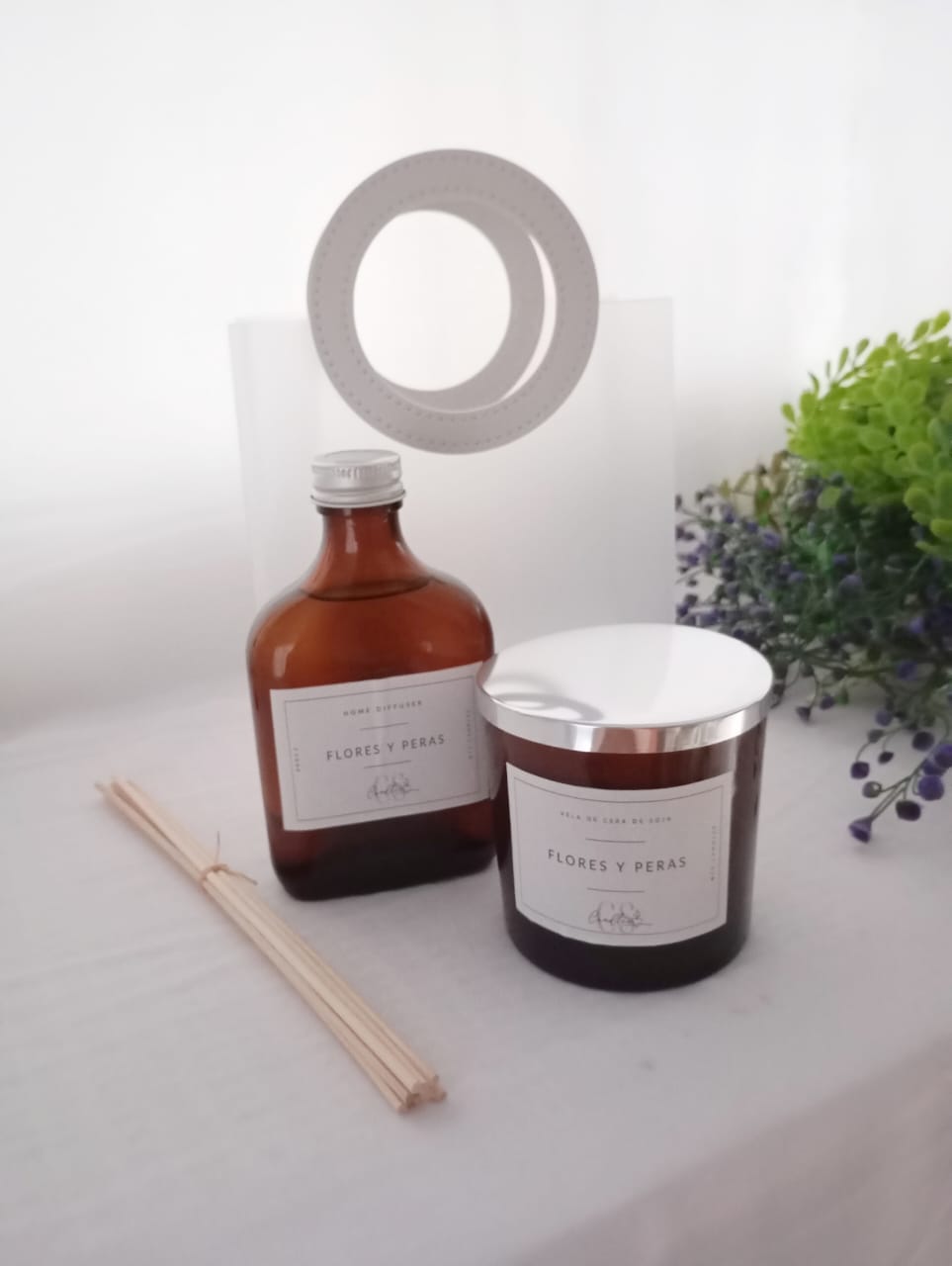 VELA AMBAR MAS DIFUSOR DE VARILLAS PETACA AMBAR, EN BOLSA DE PVC CON MANIJA DE CUERINA.