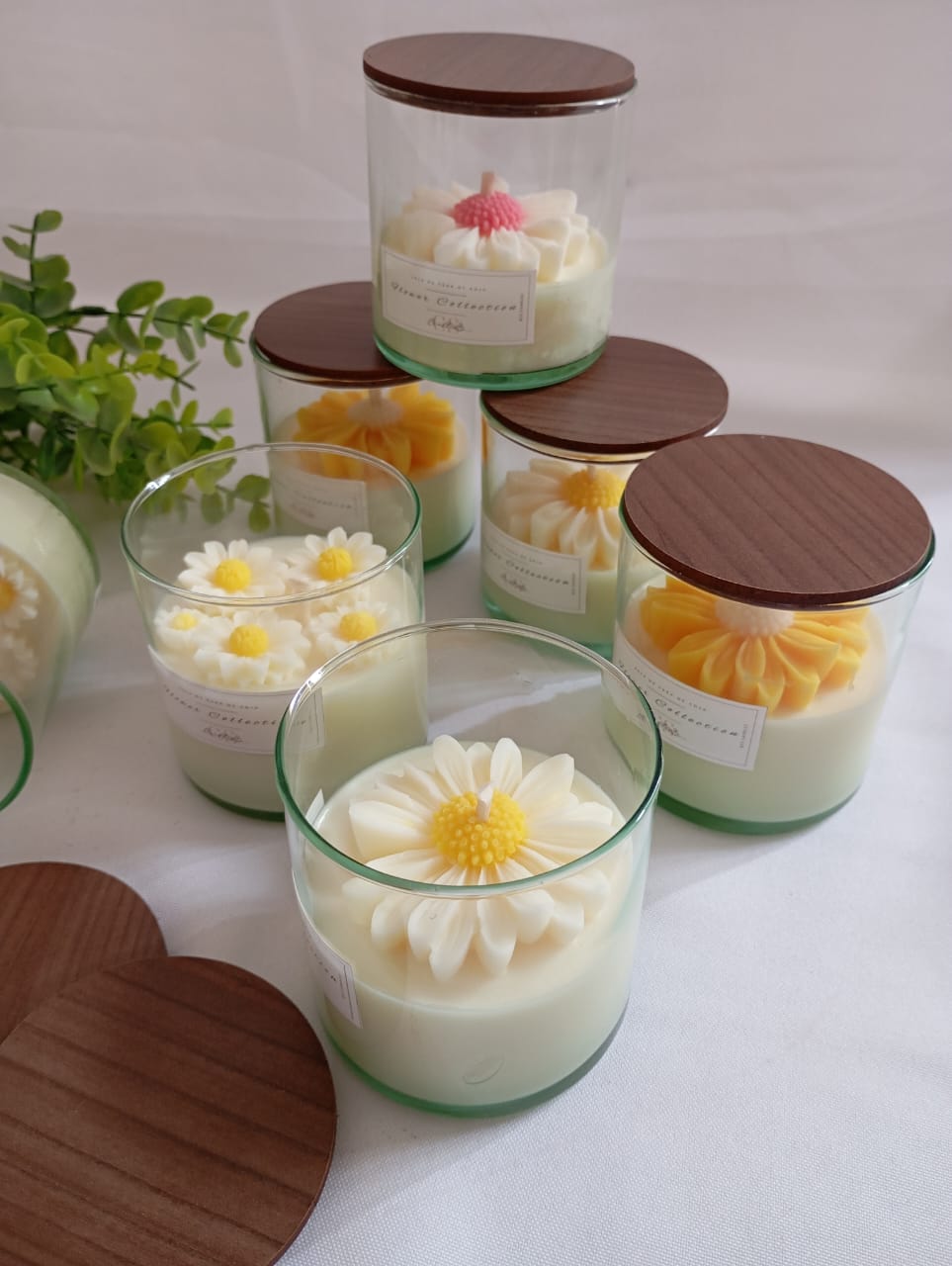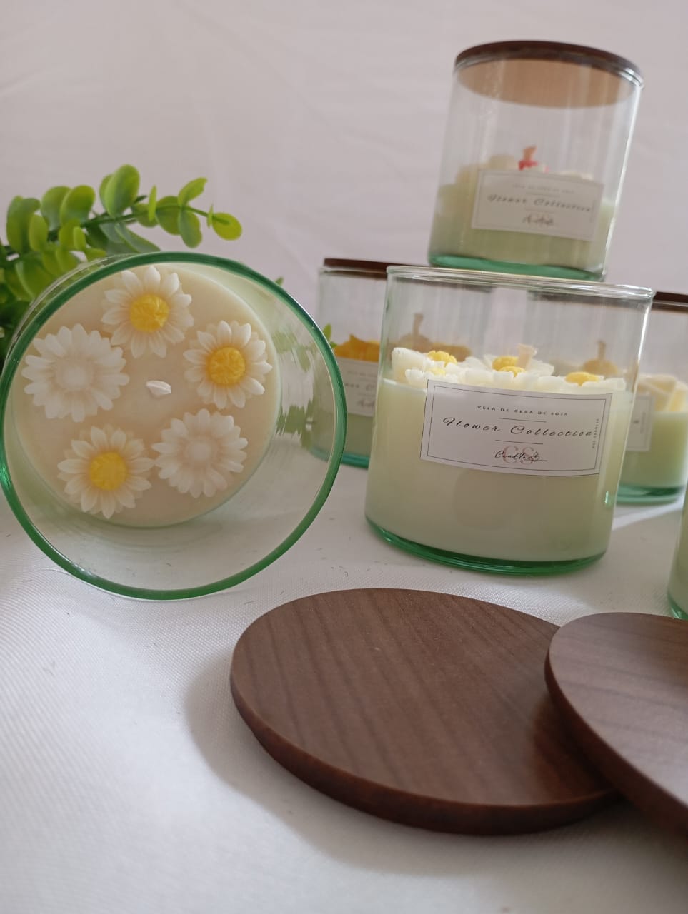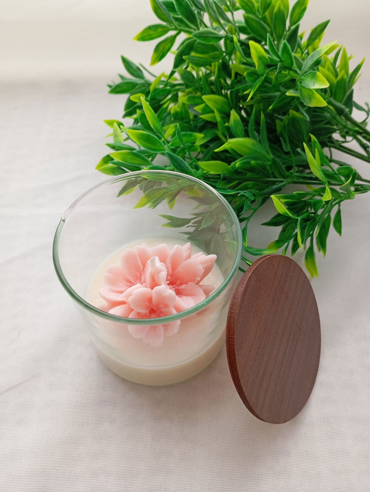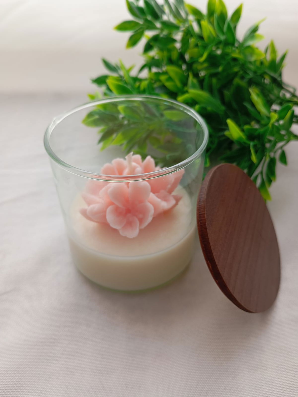 VELA AROMATICA DE CERA DE SOJA, ENVASE DE VIDRIO MODELO ROMA, CON FLOR DE MODELO A ELECCION, Y TAPA DE MADERA.