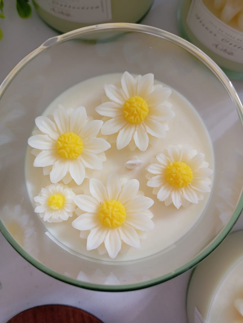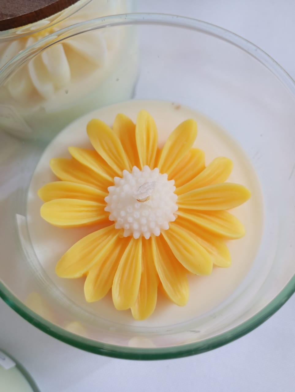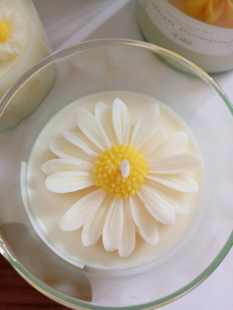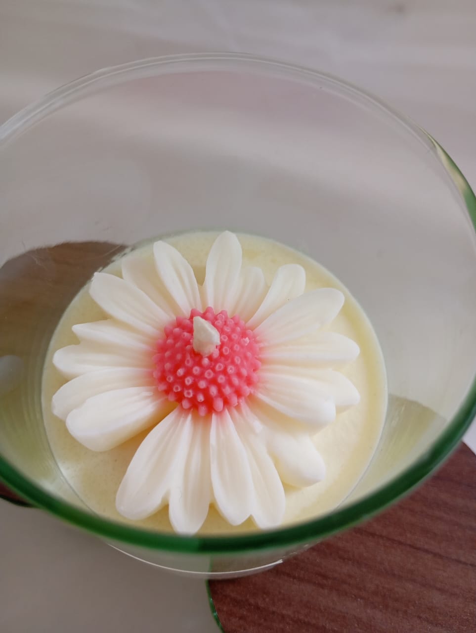 VELA AROMATICA DE CERA DE SOJA, ENVASE DE VIDRIO MODELO ROMA, CON FLOR DE MODELO A ELECCION, Y TAPA DE MADERA.