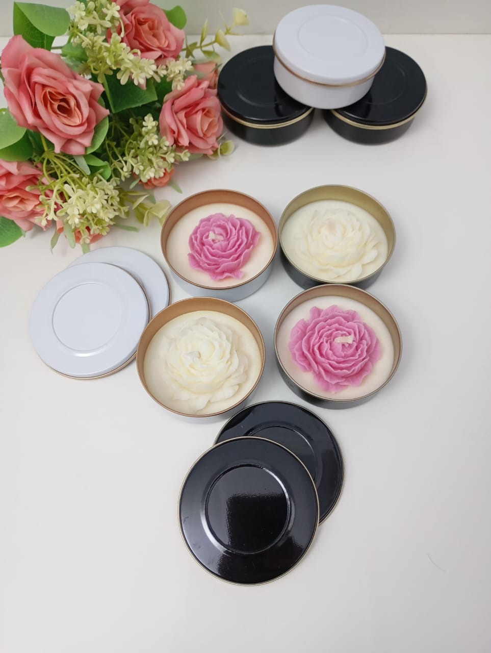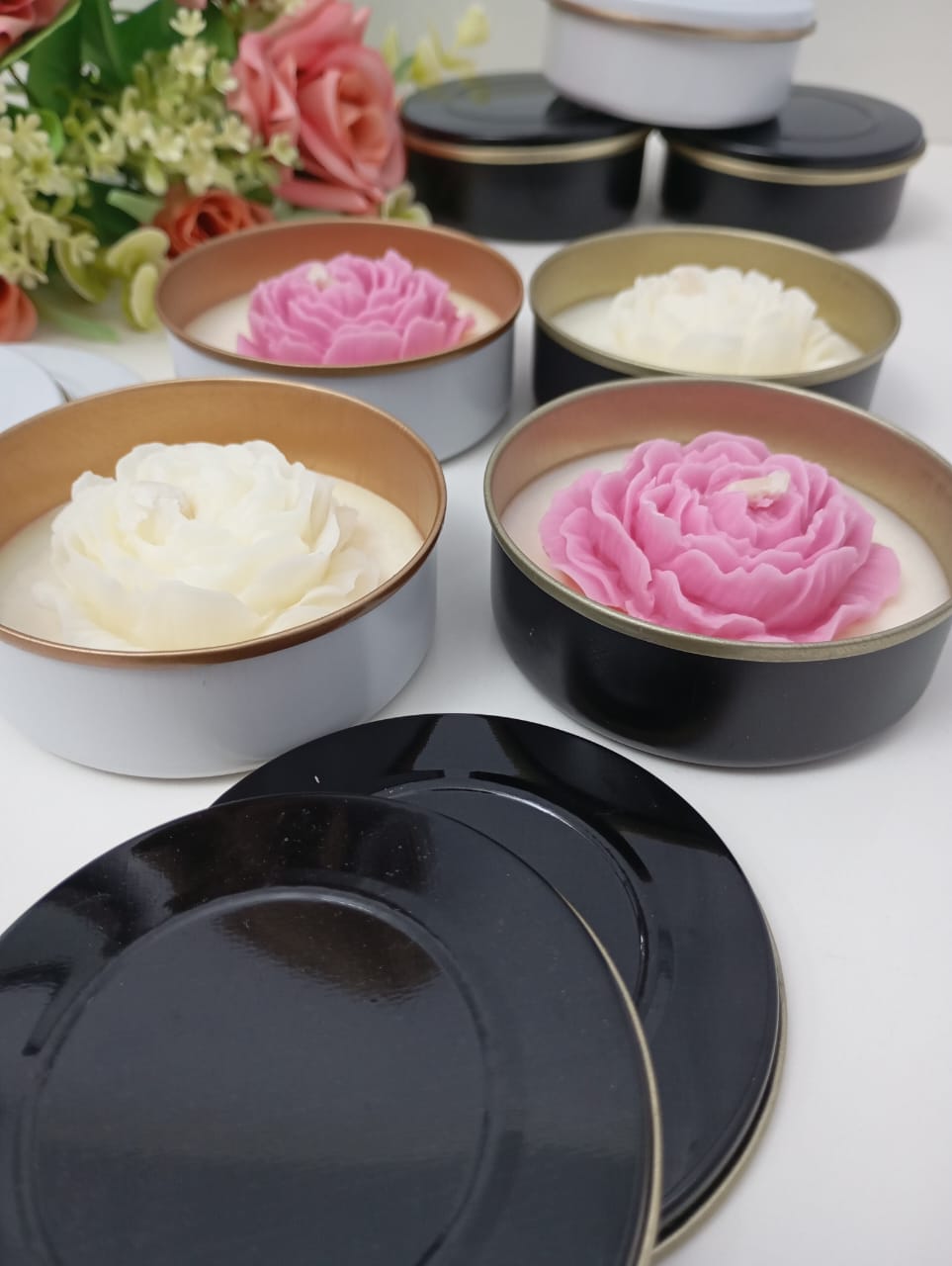 VELA AROMATICA DE CERA DE SOJA, EN LATA, CON FLOR PEONIA.