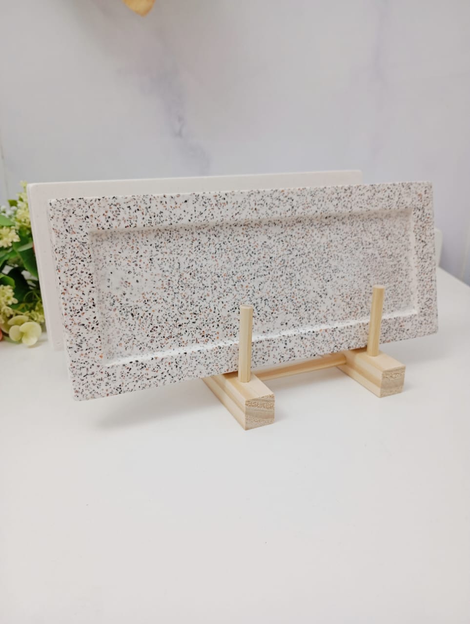 BANDEJA ARTESANAL DE RESINA CERAMICA, MODELO RECTANGULAR DE BORDES, DE 12*27.5 CM APROX, CON TOPES DE CORCHO EN LA BASE.