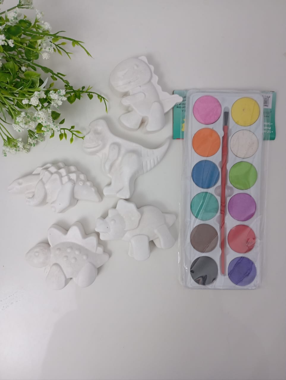 KIT DE 5 PIEZAS DE RESINA CERAMICA, MODELO DINOSAURIOS, EN CRUDO PARA PINTAR, MAS JUEGO DE 12 ACUARELAS.