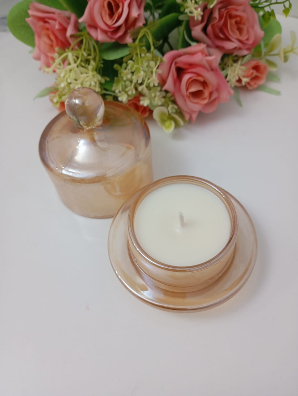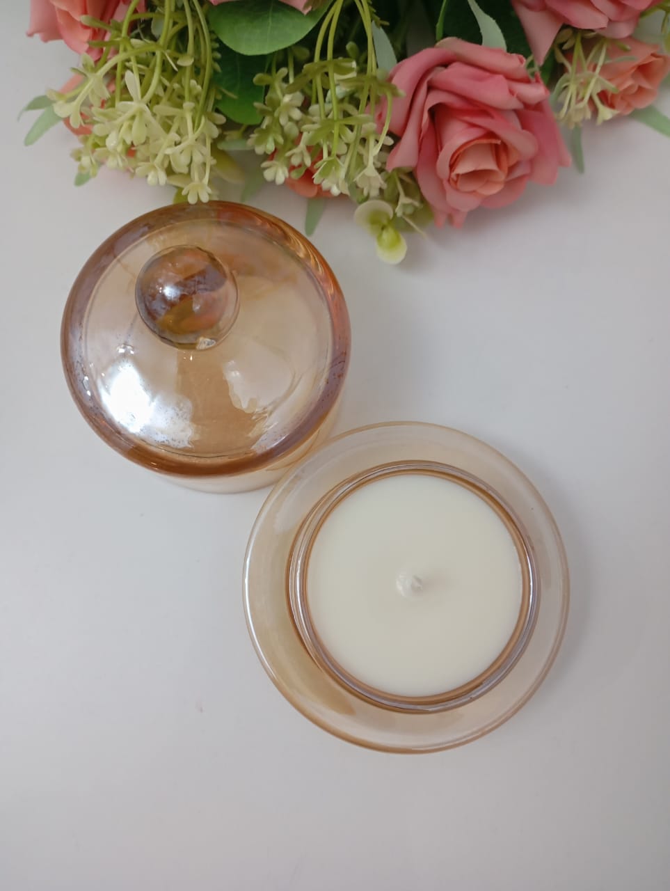 VELA AROMATICA DE CERA DE SOJA, EN ENVASE VIDRIO TRANSPARENTE COLOR MIEL CON CUPULA.