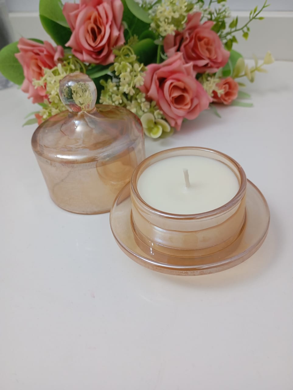 VELA AROMATICA DE CERA DE SOJA, EN ENVASE VIDRIO TRANSPARENTE COLOR MIEL CON CUPULA.