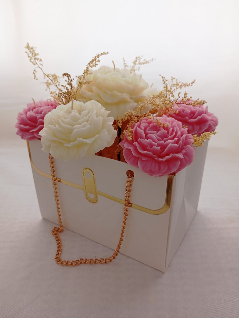 ARREGLO FLORAL EN CAJA PORMA DE CARTERA, 2 PRESENTACIONES: