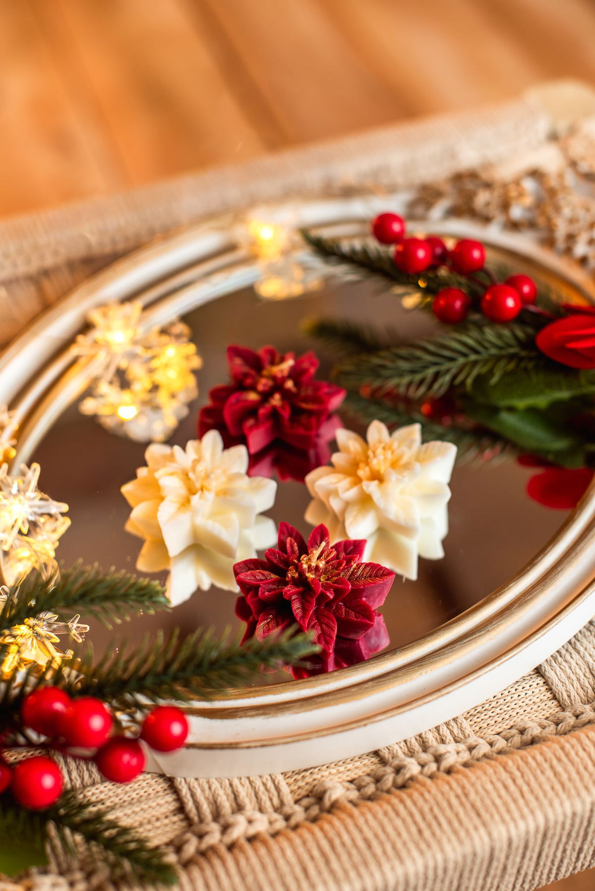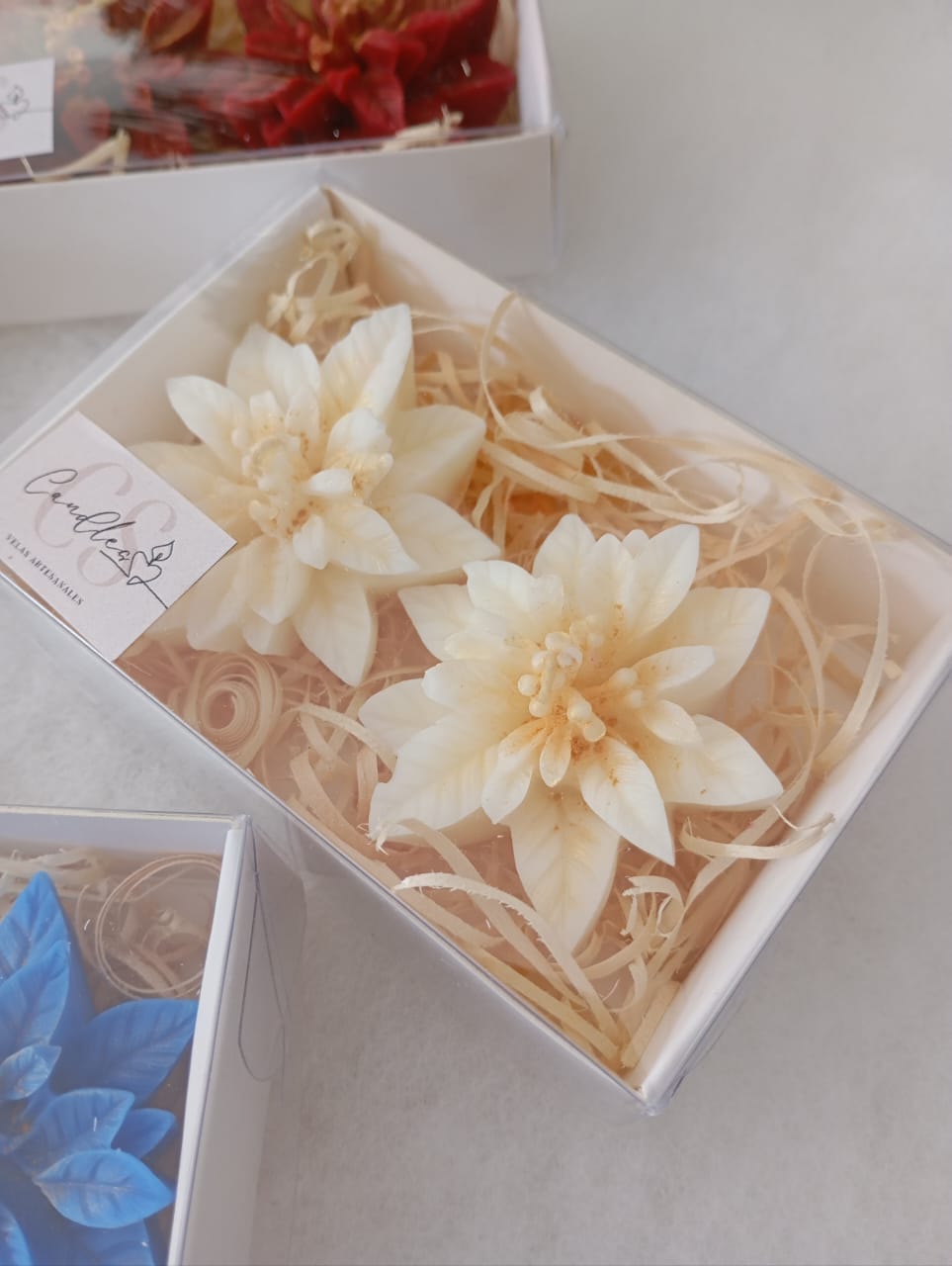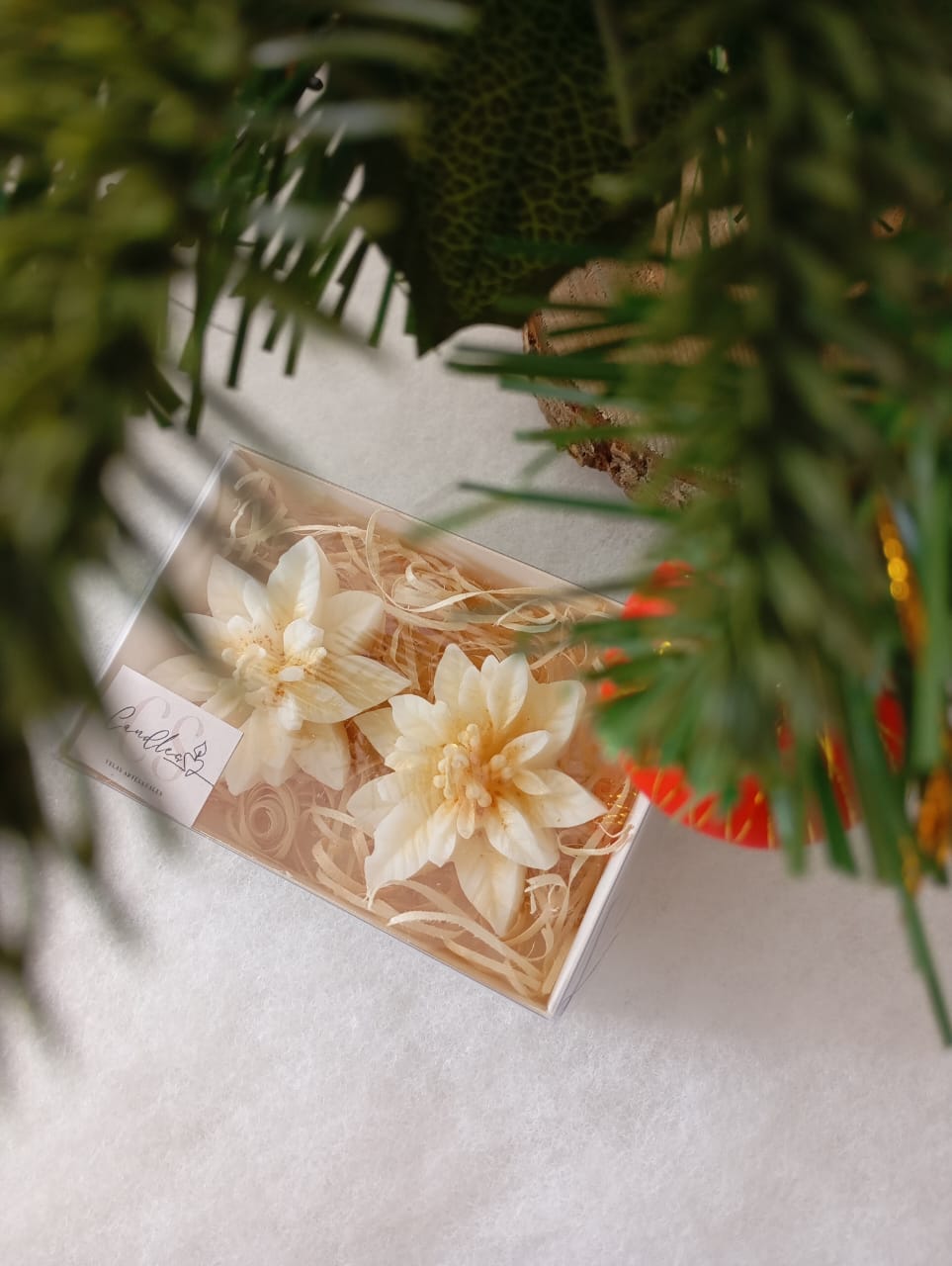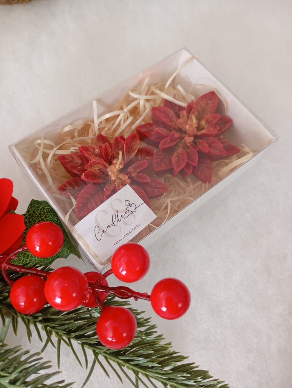 VELAS AROMATICAS DE CERA DE SOJA, MODELO FLOR DE NAVIDAD.