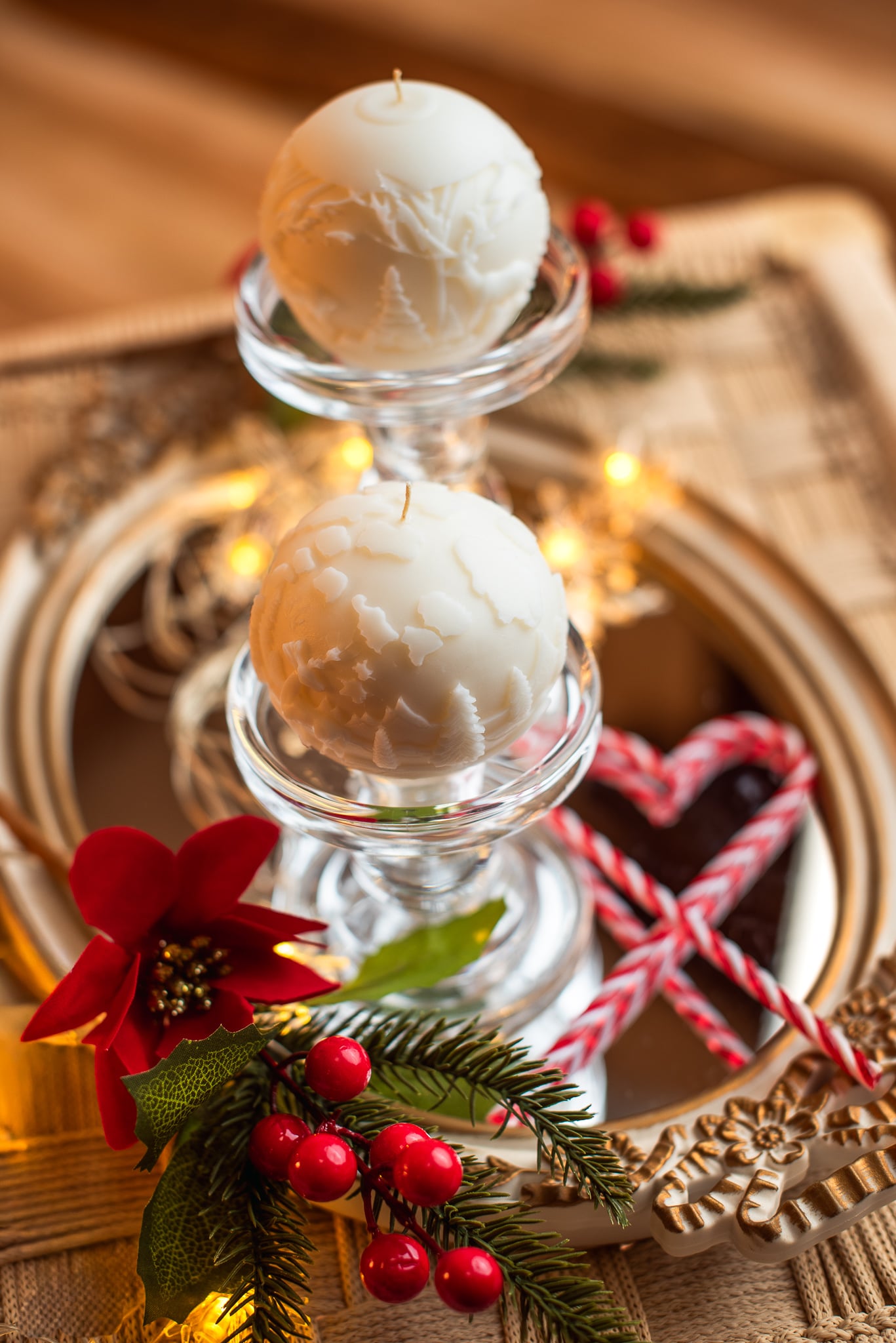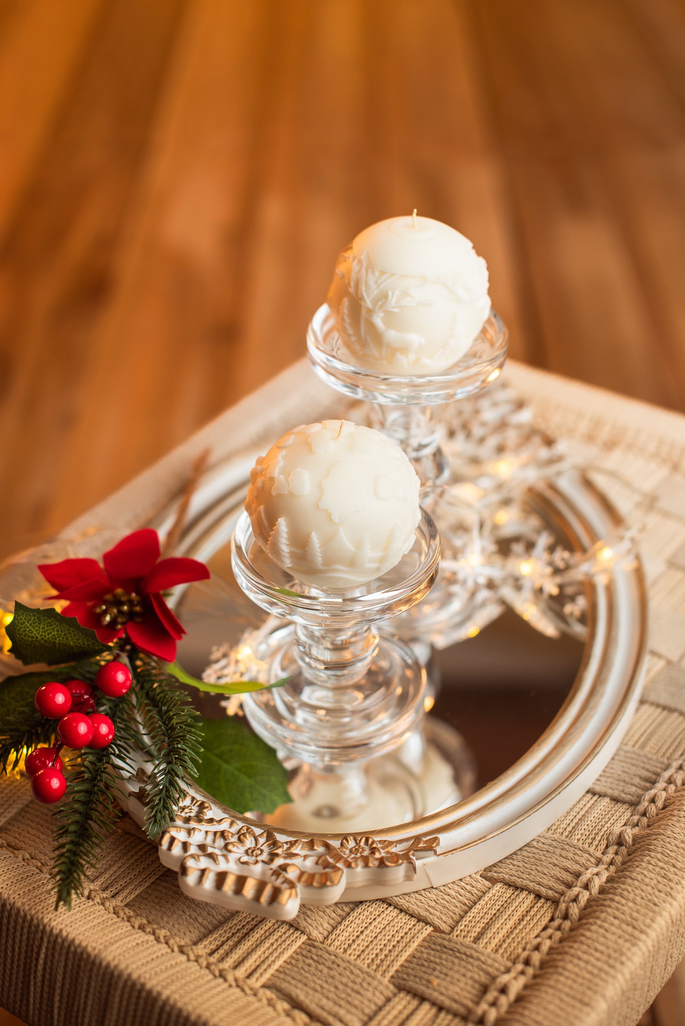 VELA AROMATICA DE CERA DE SOJA, MODELO ESFERA TALLADA RENO 2 (MAS ATRAS EN LA IMAGEN), DE CM APROX. COLOR BLANCO NATURAL DE LA CERA