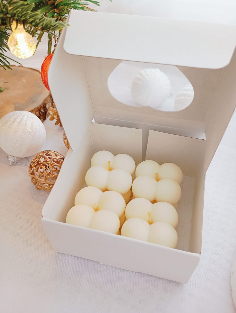 EL VALOR PUBLICADO ES POR UNA CAJA CON CUATRO VELAS MINI BUBBLE, COLOR BLANCO NATURAL DE LA CERA, AROMA SEGUN SELECCION.