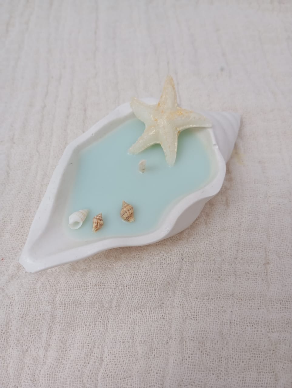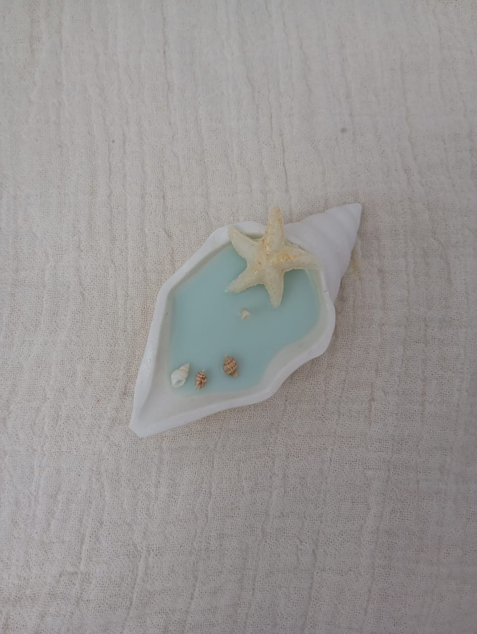 VELA AROMATICA DE CERA DE SOJA, EN PIEZA ARTESANAL DE RESINA CERAMICA - CARACOL LARGO, CON DETALLES DE CARACOLES, PERLAS Y/O FIGURAS EN CERA.