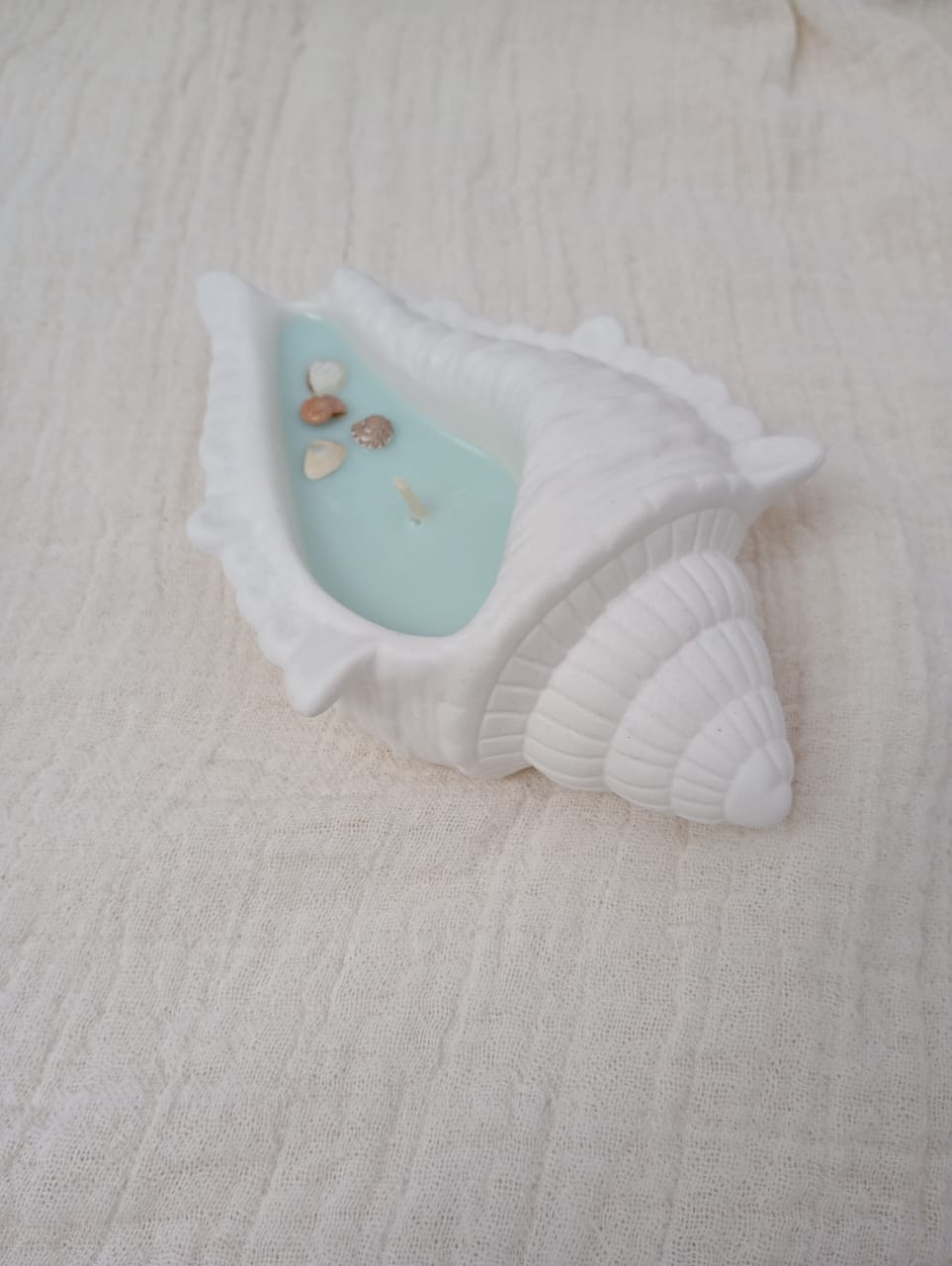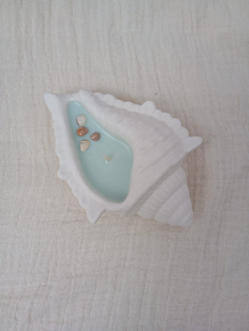 VELA AROMATICA DE CERA DE SOJA, EN PIEZA ARTESANAL DE RESINA CERAMICA - CARACOL TALLADO XL, CON DETALLES DE CARACOLES, PERLAS Y/O FIGURAS EN CERA.