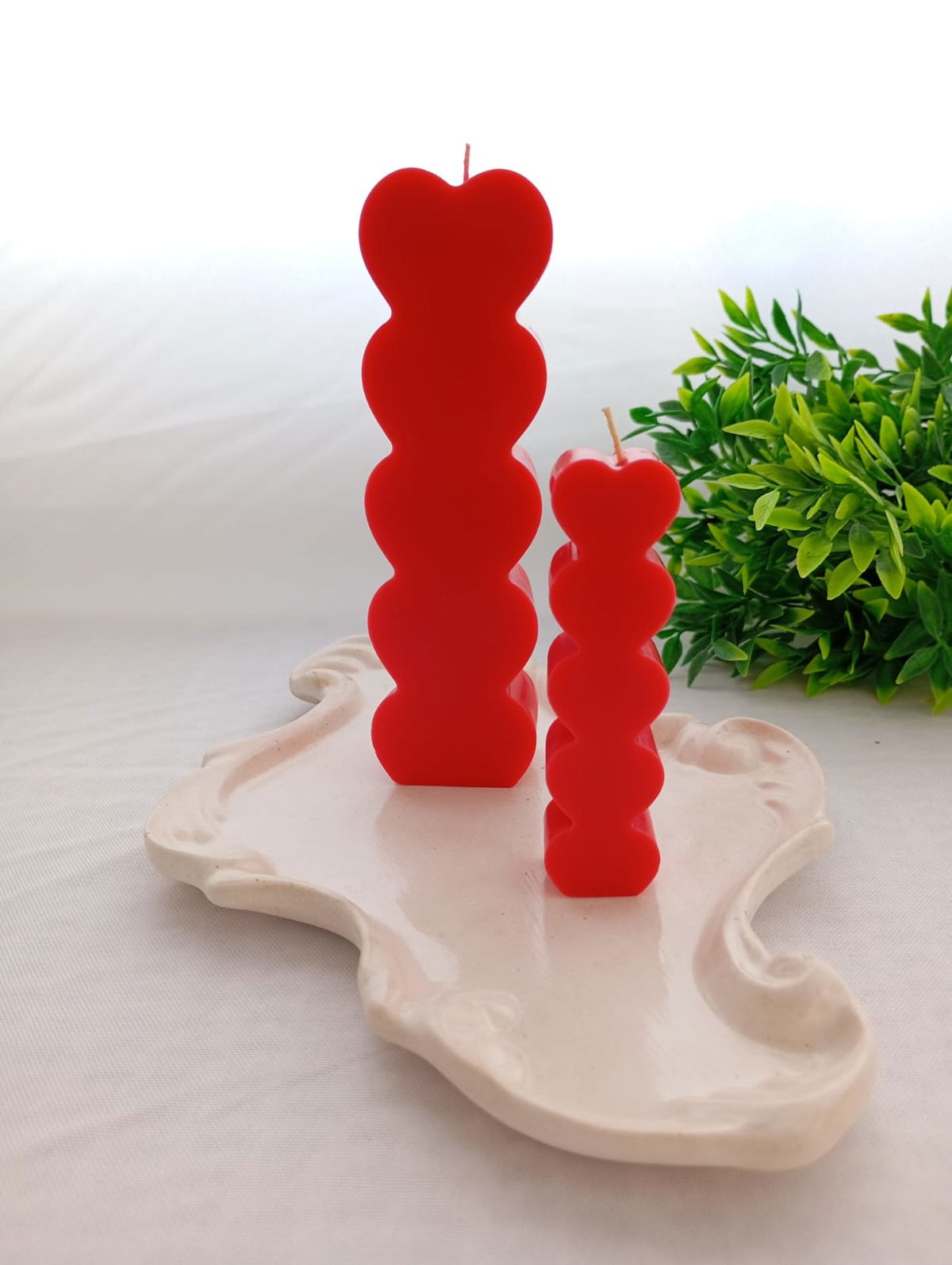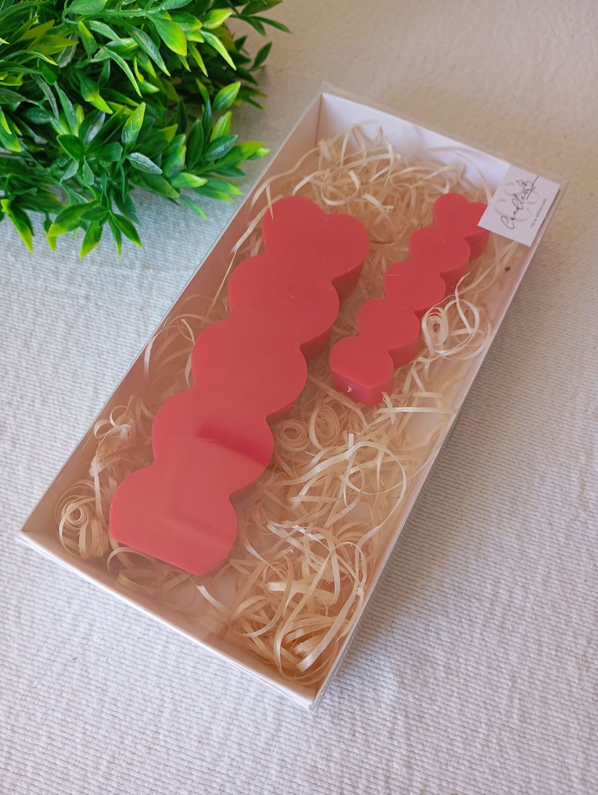 BOX COMPUESTO DE 2 VELAS AROMATICAS DE CERA DE SOJA, MODELO PILAR CORAZONES, DOS TAMAÑOS, COLOR ROJO.